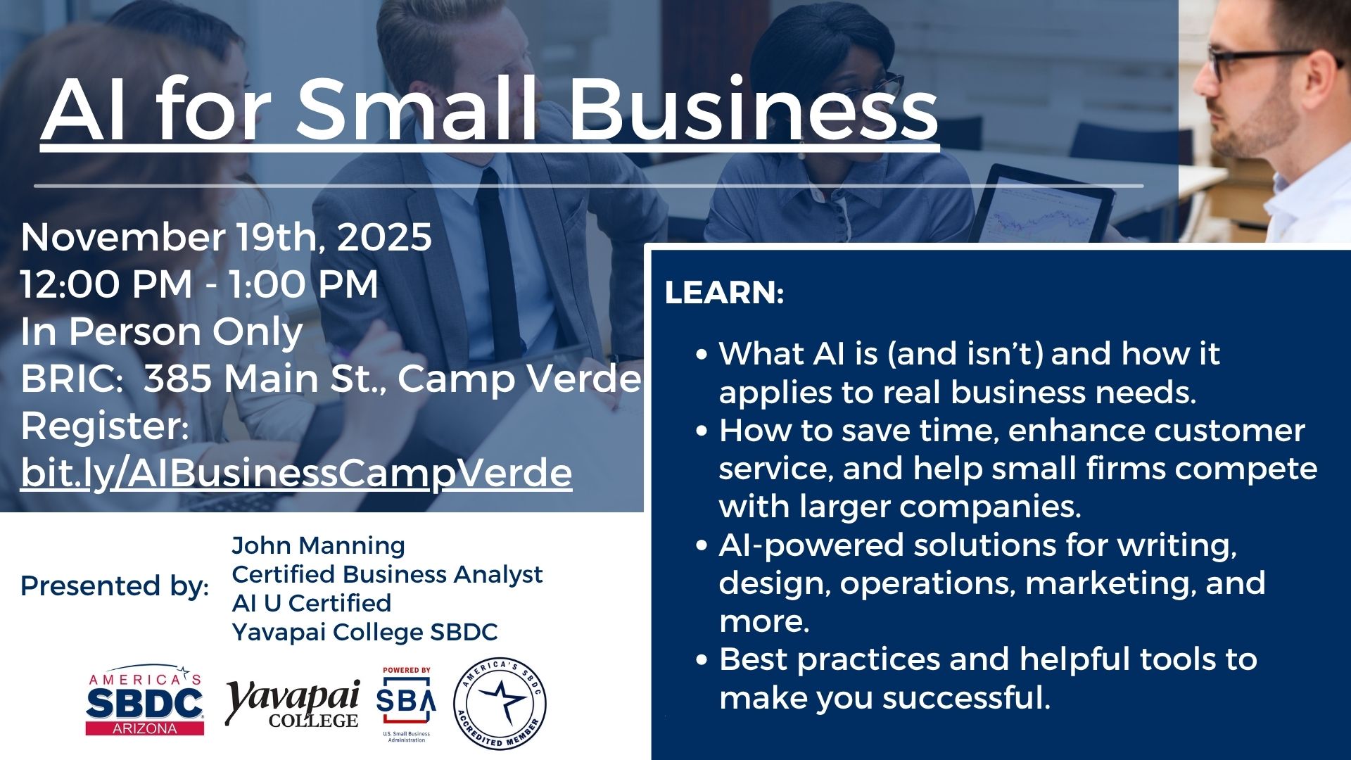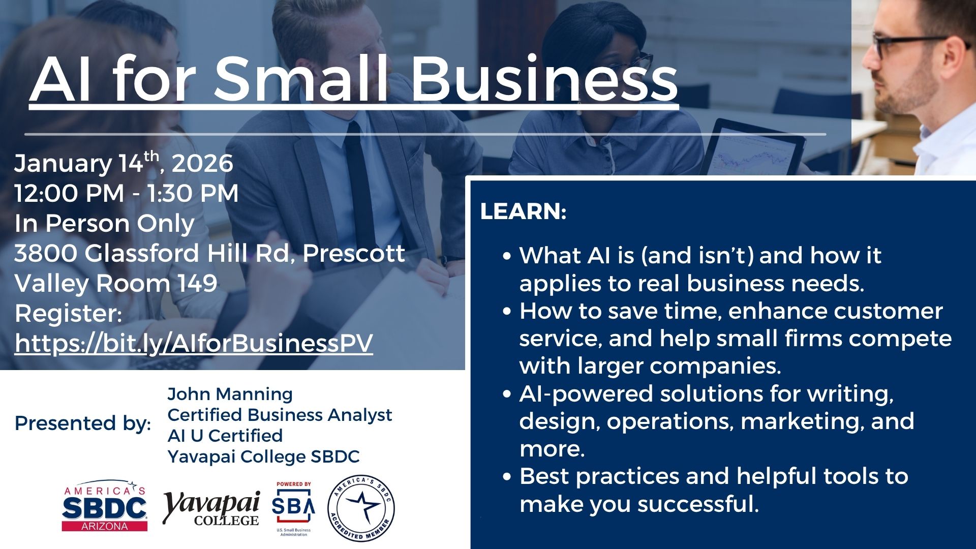 Presenter: John Manning, Certified Business Analyst & AI U Certified, Yavapai College SBDC