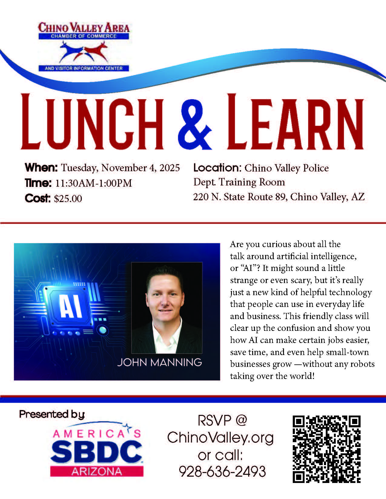 Curious about Artificial Intelligence but not sure where to start? Join us for an eye-opening Lunch & Learn with John Manning on how AI can make your work easier, save time, and help small-town businesses thrive — no robots required!